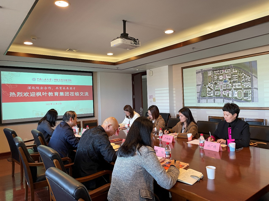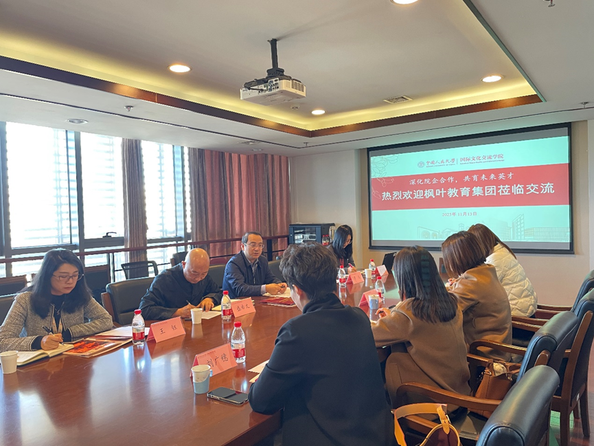 11月13日下午,中国人民大学国际文化交流学院与枫叶教育集团合作交流会在国学馆525会议室举行。枫叶教育集团英语语言与汉语语言事业部轮值副总裁唐时雨、首席运营官尹楠楠等一行到访参会。我院院长王建华、党委副书记王钰等出席会议,副院长盛希文主持。